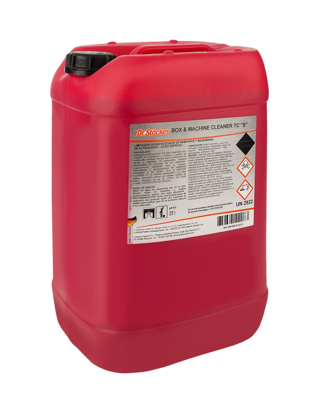 Limpiador desincrustante de mamparas y maquinaria de túneles de autolavado, en formato de 25 L, apto para la limpieza de llantas y depósitos de carburante. Elimina eficazmente las suciedades más difíciles. Está especialmente indicado para lavaderos de vehículos y talleres mecánicos.