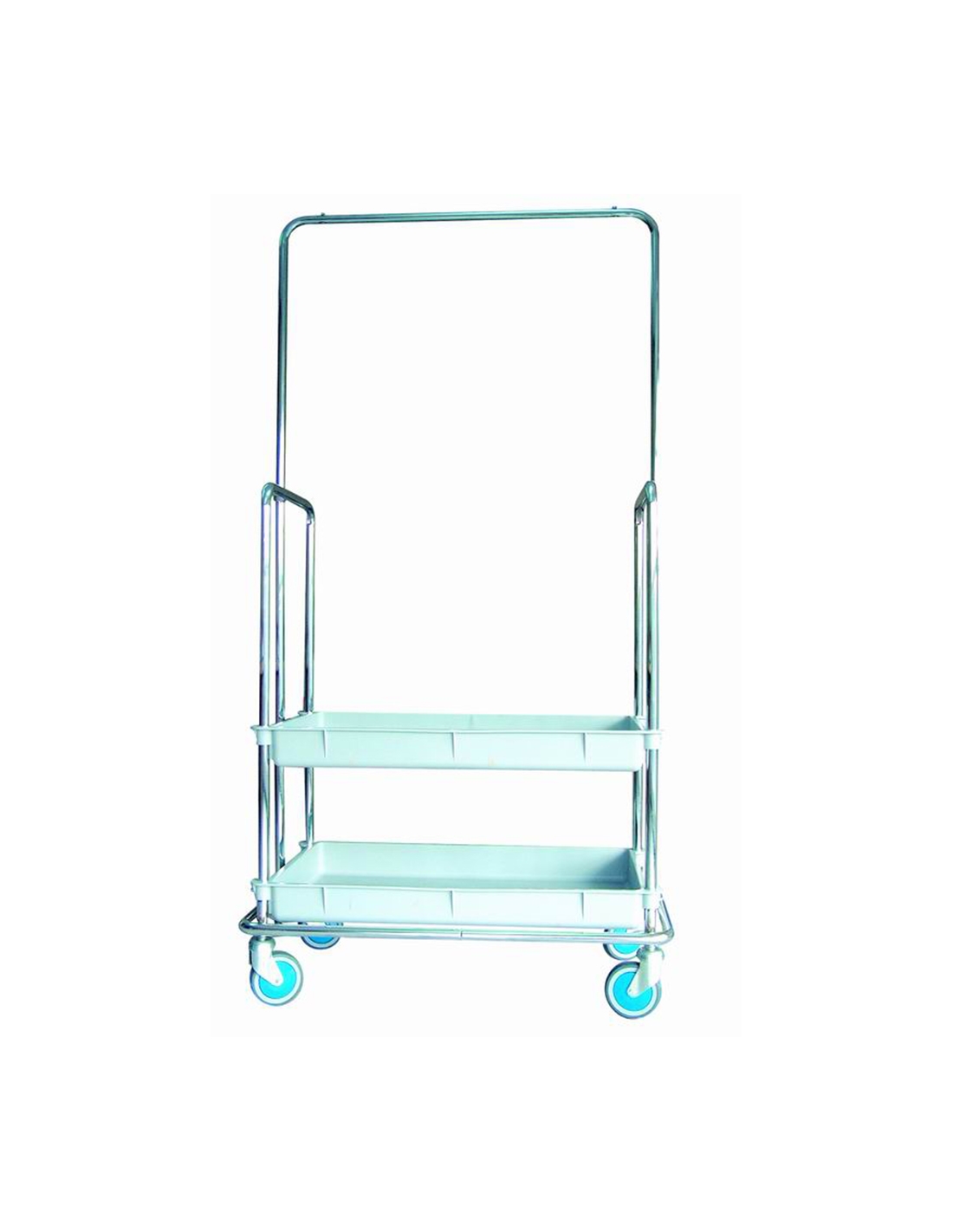 Carro para transporte de lenceria cromado.Con base gris.Carro cromado, 3 bandejas de plástico polipropileno, 2 bolsas plastificadas, asas telescópicas, ruedas de 125 ¥.La capacidad de la bolsa es de 77 litros.