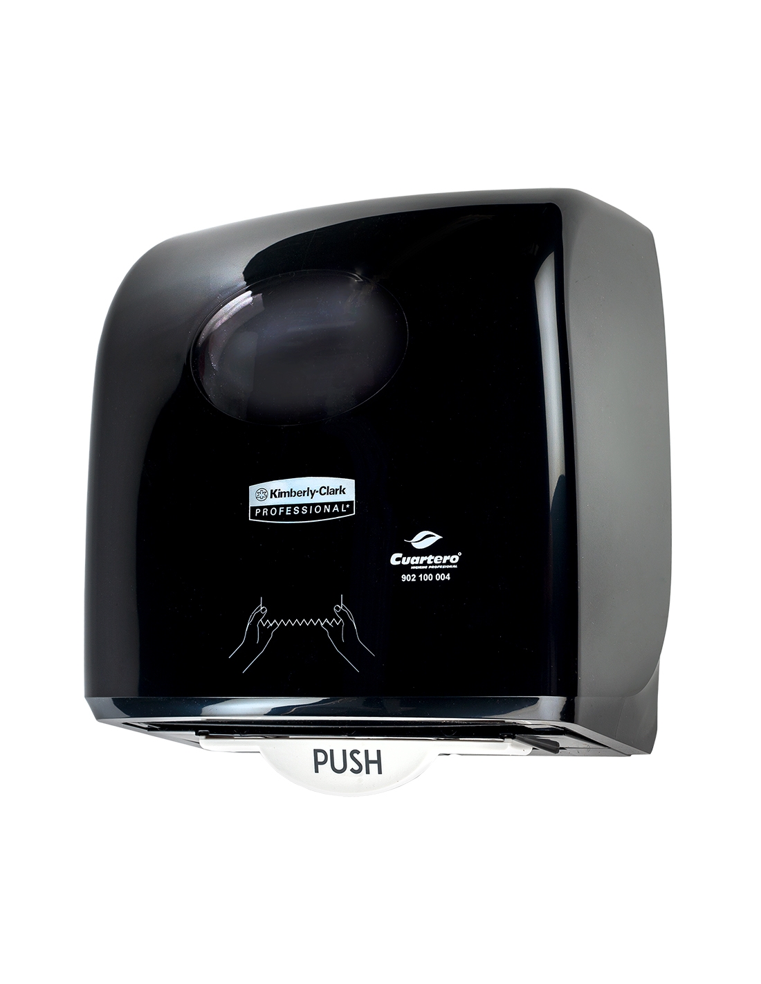 Dispensador de toalla en rollo en color negro, evita la contaminación cruzada, garantizando una correcta higiene en todo tipo de aseos. Asegura un suministro constante de toalla en rollo, está especialmente indicado para aseos en bares, restaurantes y establecimientos públicos en general.