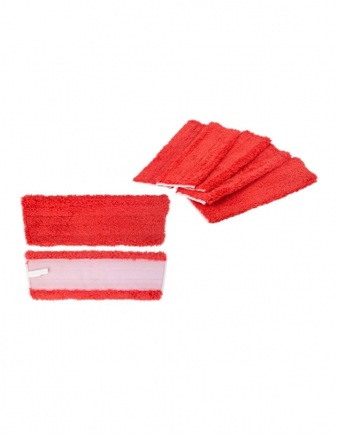 Recambio de mopa con velcro en microfibra aconsejado para el lavado y la desinfección de mesas, superficies lisas y las paredes. Compuesto por un soporte de velcro e hilo de microfibra; la microfibra recoge y retiene el polvo y la suciedad y los libera en fase de aclarado.