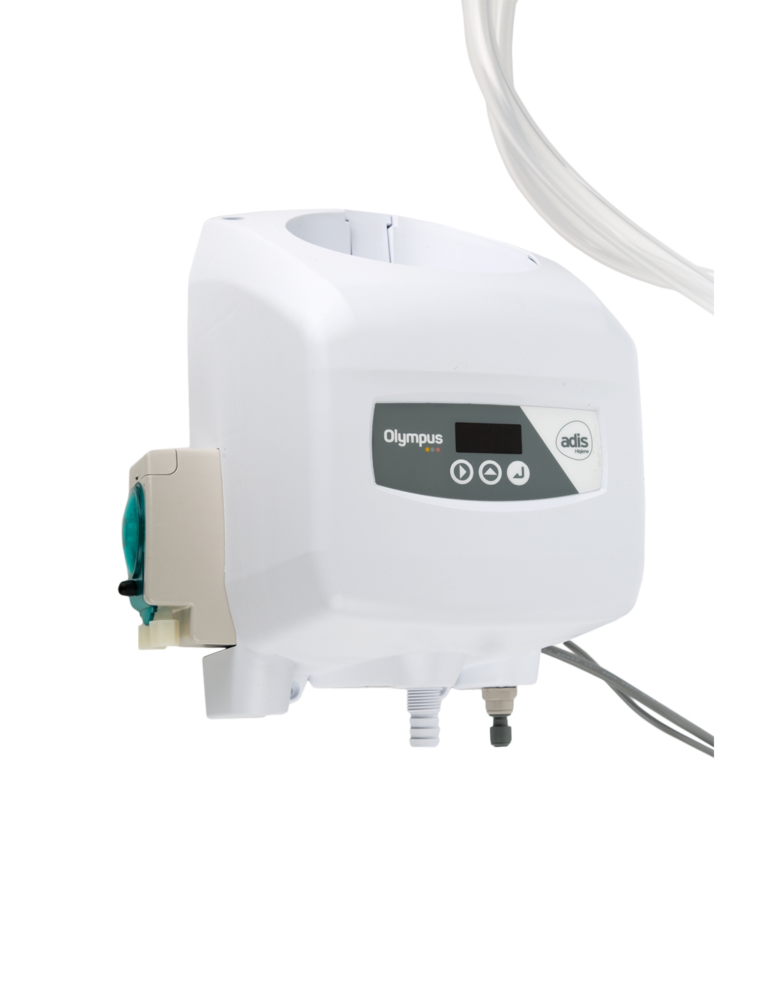 Dosificador de detergente y abrillantador Olympus para lavavajillas de cúpula y túnel. Dosifica de forma exacta y precisa la cantidad necesaria del producto en la fase correspondiente, con lo que permite asegurar excelentes resultados de lavado, evitando derrochar producto y garantizando la seguridad del personal.