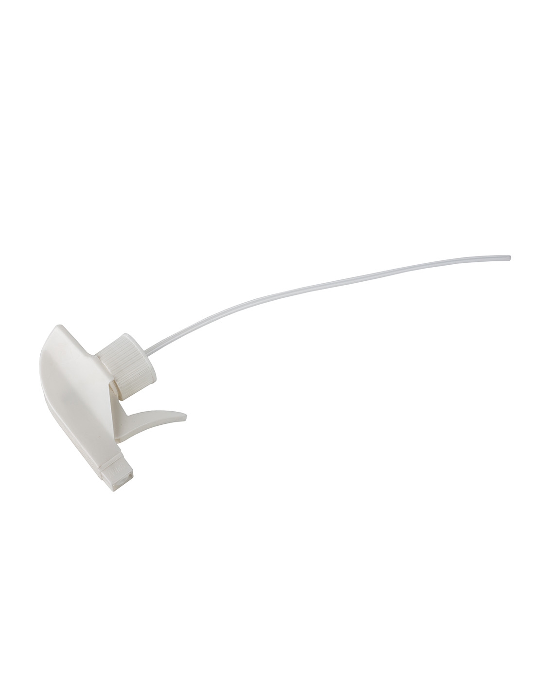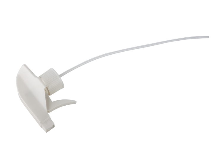 Pistola pulverizadora en color blanco, apta para cualquier tipo de botella estándar, gracias a su boquilla puede regularse la pulverización en spray o en chorro, adecuándose así a todo tipo de necesidades.