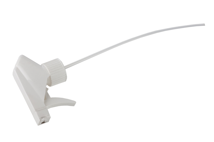 Pistola pulverizadora en color blanco, apta para cualquier tipo de botella estándar, gracias a su boquilla puede regularse la pulverización en spray o en chorro, adecuándose así a todo tipo de necesidades.